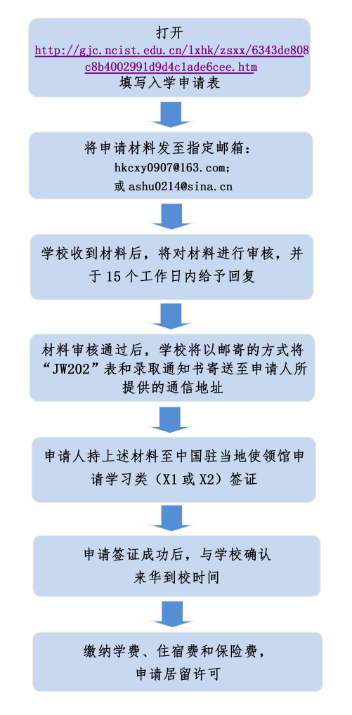 1、入学申请表 2、护照复印件 3、学历证明及成绩单复印件(中文翻译) 4、体检证明 5、个人简历 6、银行存款证明 7、无犯罪记录证明 8、两寸照片4张 |
